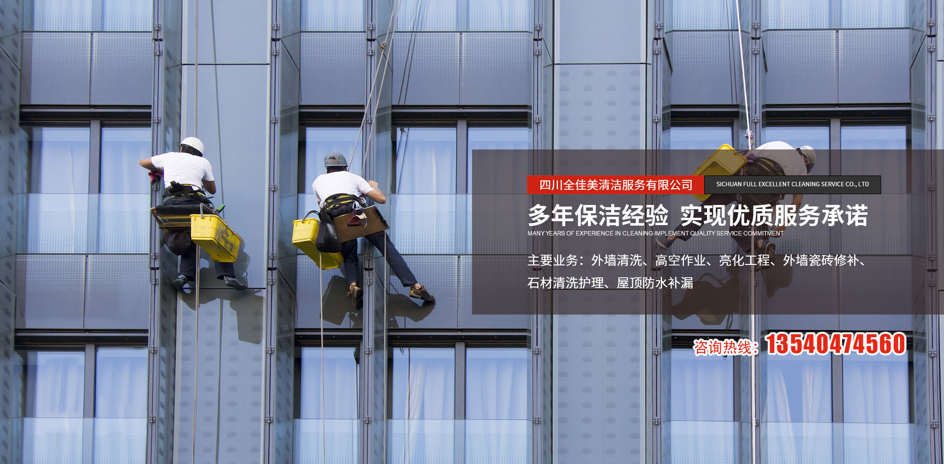 四川全佳美清潔服務有限公司成立于2017年11月20日,注冊資本200萬元人民幣,是一家專業從事高空外墻清洗,外墻維修,開荒保潔,石材養護,外墻防水等一體化的工程服務公司。公司先后服務于成都鐵路培訓學校,雙流空港酒店,省體育館等寫字樓及工業園區的外墻清洗保潔及維修服務。經過多年的發展與努力,公司已具備一定的規模及實力。現擁有一支技術精湛的服務團隊,以高標準的服務品質,專業的安全技術實力,為全川不同群體的客戶提供更安全,更周到的清洗服務解決方案,期待與你的合作。
